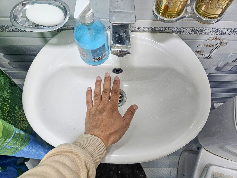 세면대가 매우 작다. 칫솔과 비누 샴푸, 수건이 있고 수건은 매일 교체 해 준다.
