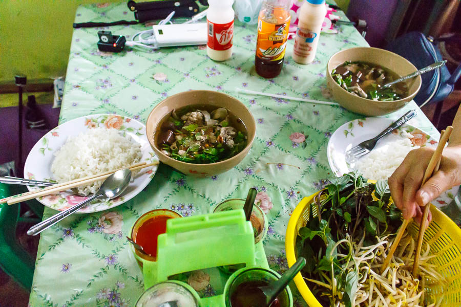 식당에서 남자 2명이 먹고 있는거 시켰더니 돼지 선지국 비슷한거다. 배고픈 시간대에 맞있는 식사. 40밧.