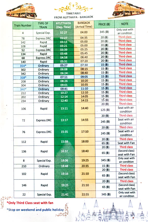 아유타야출발 방콕도착 기차 시간표.